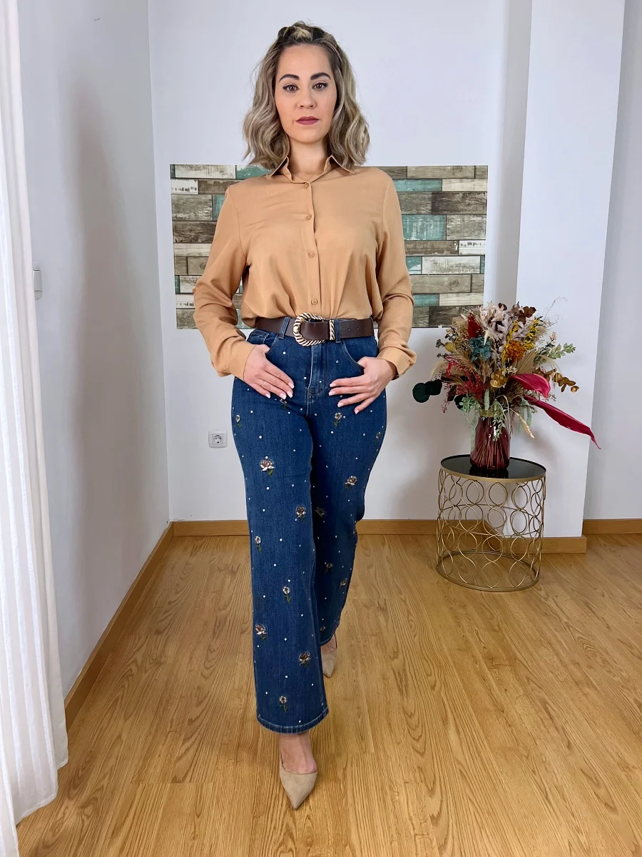 Es una camisa de manga corta con botones decorativos en el hombro izquierdo, tejido muy suave.